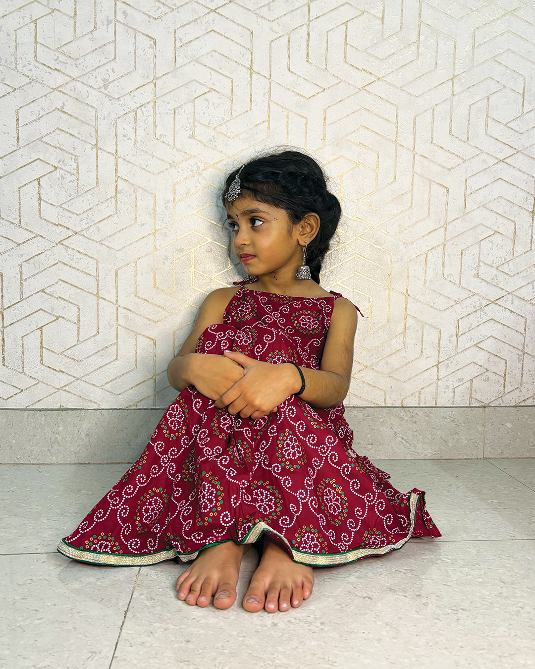 Ideal for Navratri, weddings, family functions, or school events – this outfit blends tradition with playful charm.