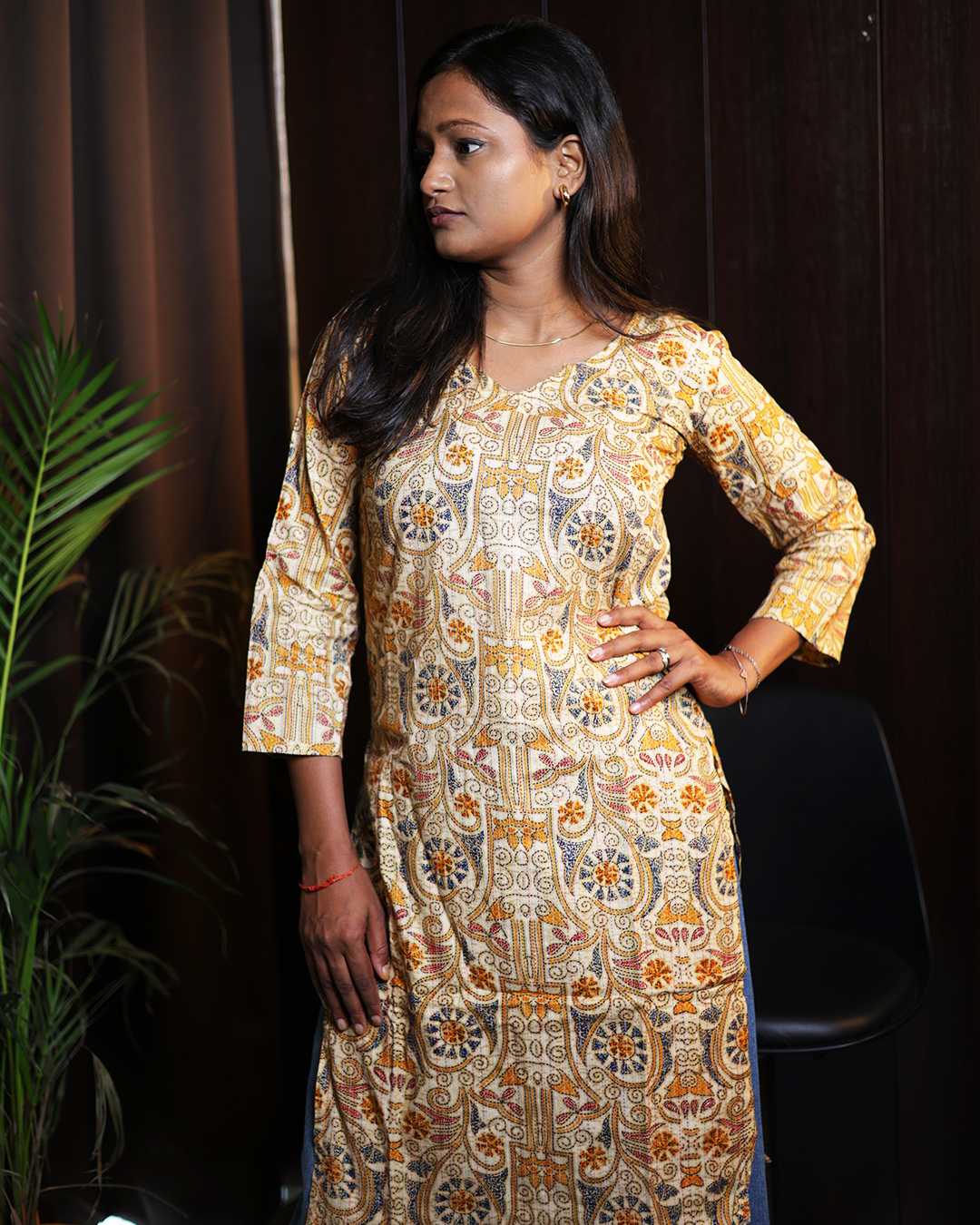 - Featuring a blend of mustard, maroon, and navy patterns inspired by ancient Indian murals, this kurti is crafted from soft, breathable cotton that ensures all-day ease.